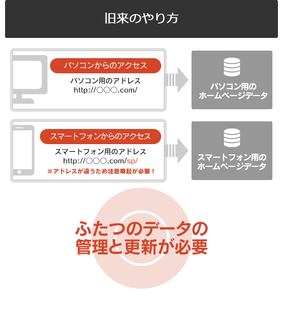 そのため、これまでは「パソコン向け」と「スマートフォン向け」の二つのホームページを用意し、ユーザーの端末に合わせてアクセスしてもらうという対策が取られてきました。ただしこの方法は二つのアドレス(URL)を告知しなければならず、さらに修正や更新の手間も倍になるなど不便なため、あまりお勧めできません。