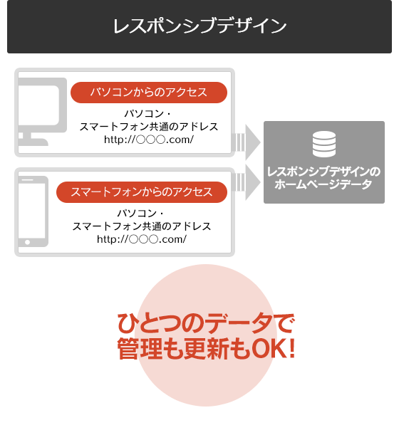 さらに、ホームページのデータもひとつだけで済みます。その中に「パソコン向け」と「スマートフォン向け」のデザインの指示が入っており、アクセスしてきた端末に合わせて自動でデザインを差し替えることができるのです。これにより、今まで通りパソコン向けの修正や更新作業をするだけでスマートフォン向けの作業も同時に完了するため、手間やコストが増える心配もありません。