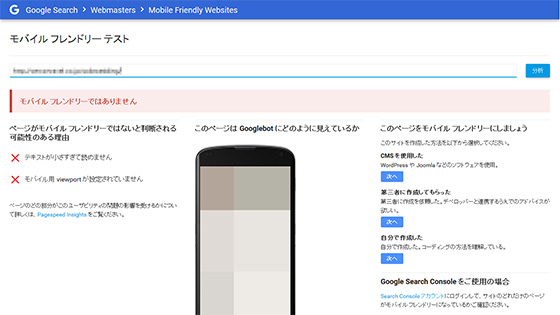 Googleはホームページのスマートフォン最適化を推進するべく「モバイルフレンドリー」の姿勢を打ち出しました。2015年4月21日以降、スマートフォンに未対応のホームページは、スマートフォンでの検索順位が下がるうえ、検索結果に「ページがモバイルフレンドリーではありません。」と表示されてしまいます。
